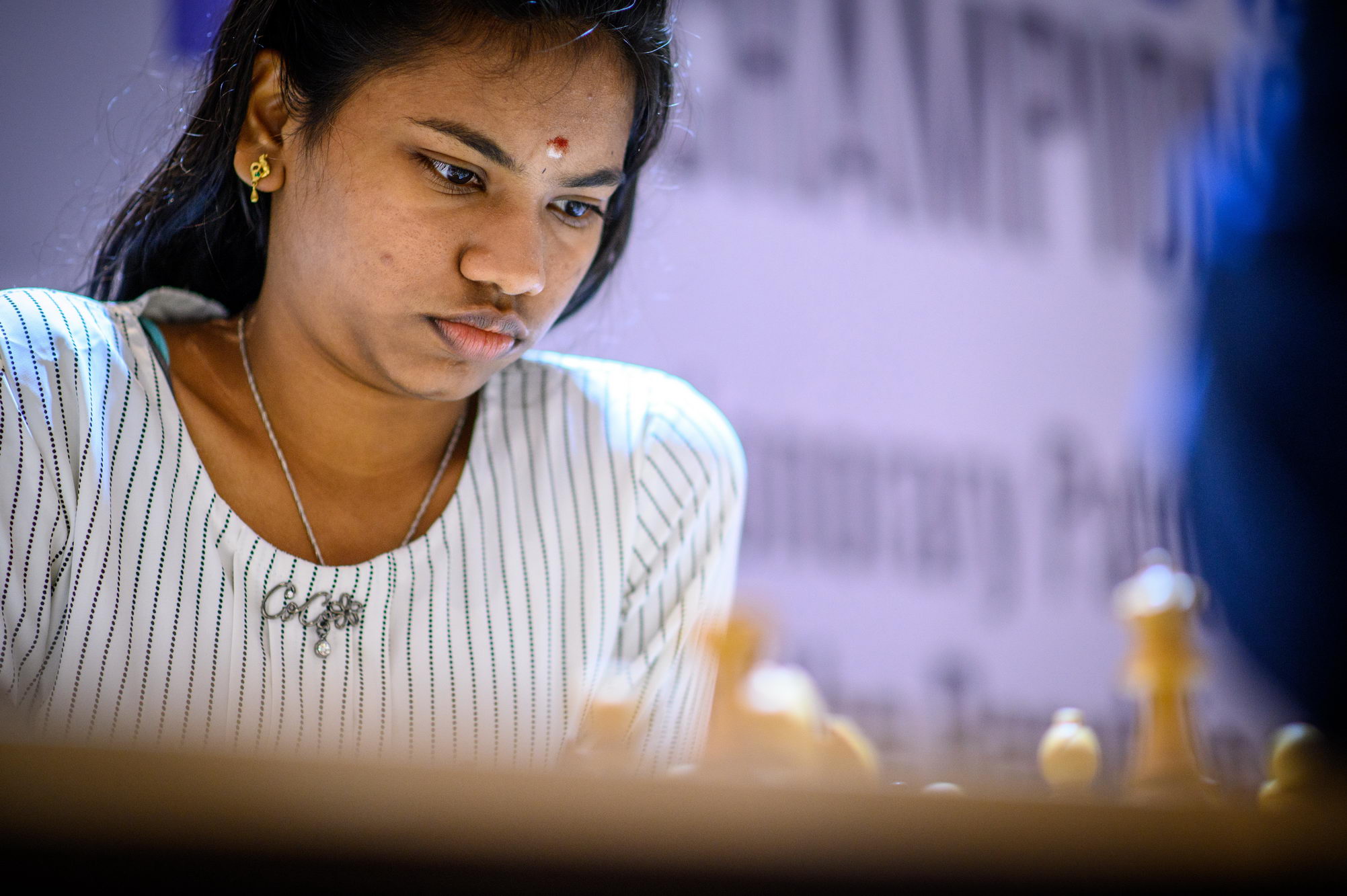 India’s defeat at the hands of the young Kazakhstan team (2½-1½) can be considered a surprise. Fatigue was probably a factor, as the Indian players were the last ones to arrive in Bydgoszcz after a long trip, so late into the evening that they even missed the opening ceremony. Harika failed to get anything with White against Assaubayeva, and the game reached a Rook endgame that was a dead draw – the same result as in boards 2 and 3. It was Amina Kairbekova, on the fourth board, who tipped the balance in favour of the Kazakhstani: with White, she sacrificed a pawn in exchange for the bishop’s pair and the initiative, preventing Black from castling. This proved to be a sound decision, as Savitha’s Rook on a8 could never get into play; under pressure, the Indian player made a mistake (23…f5?) that costed her the game.
